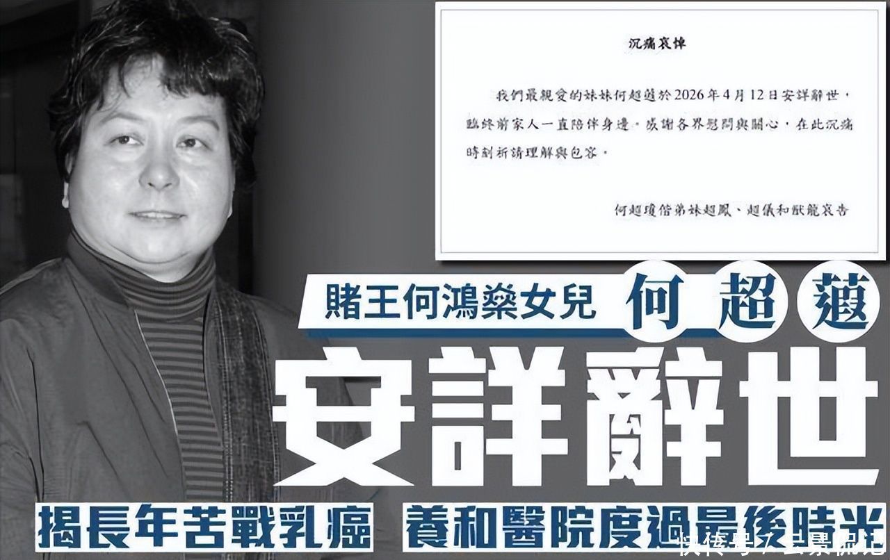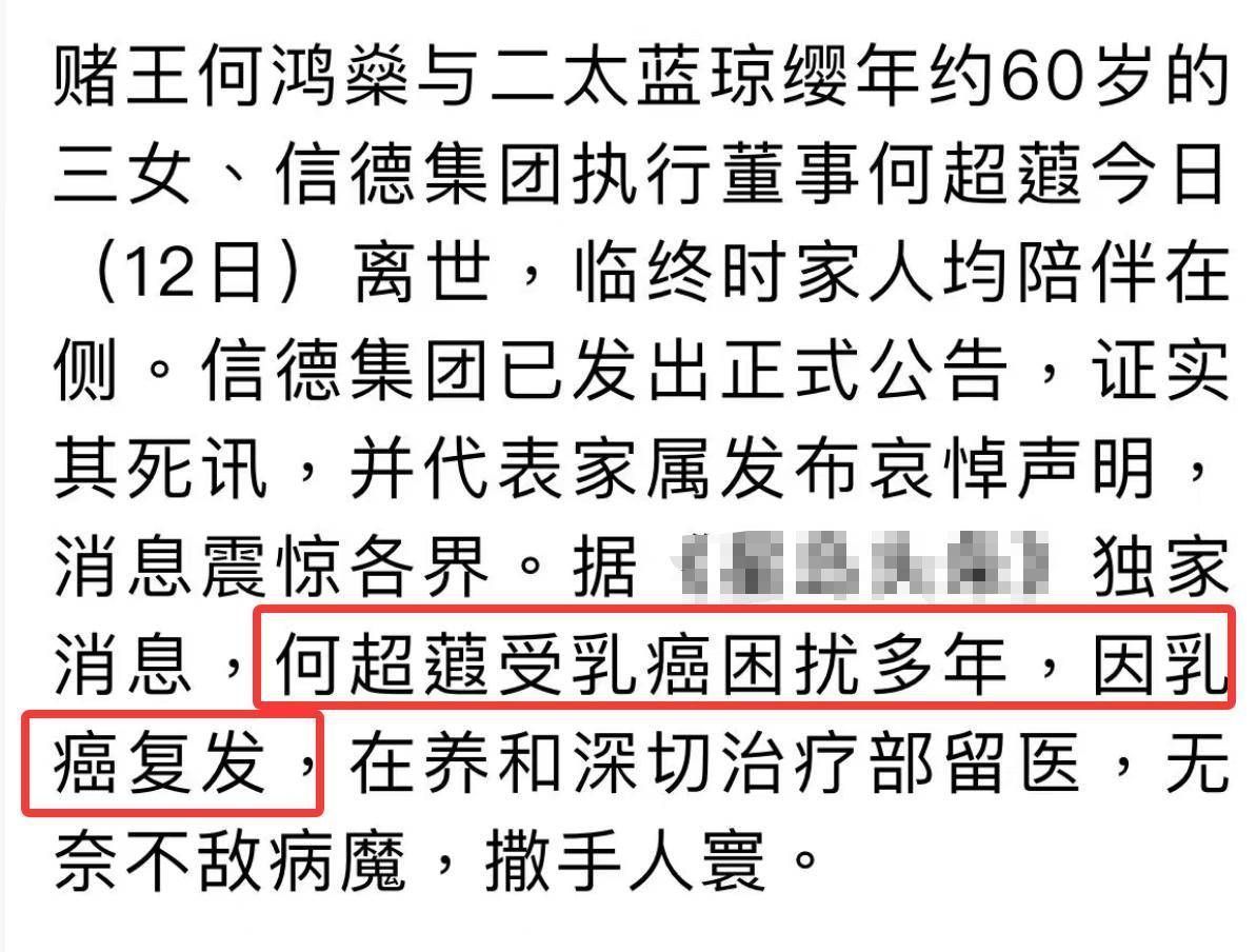 4月12日,信德集团执行董事何超蕸,在香港养和医院去世,年仅60岁,港媒发文称她是乳腺癌复发去世的。